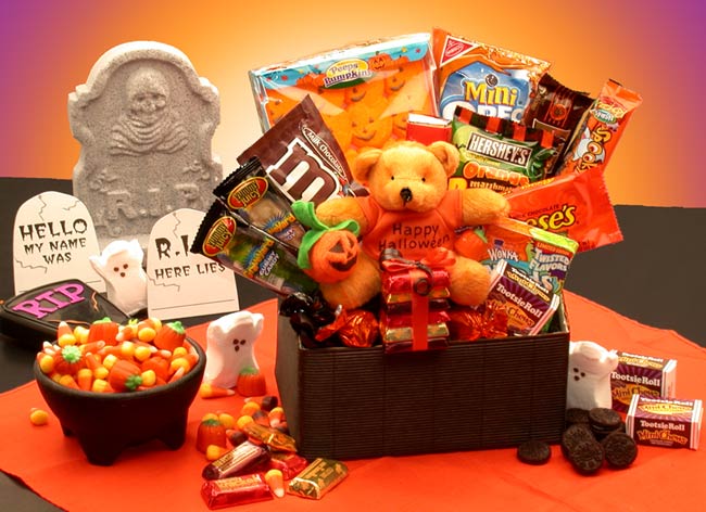 This item may be shipped overnight for Saturday Delivery. Contents: Peeps Marshmallow Pumpkins Oreos Mini Halloween Cookies Plain M & M's Reese's Peanut Butter Cups Hershey's Chocolates Nerds Candy Rope Nerds Candies Skeleton Gummies (2) Tootsie Roll Minis Box Happy Halloween Teddy Bear Hershey's Miniatures 6 pc Asst Miniature Kit Kat Bar Black Gift Box